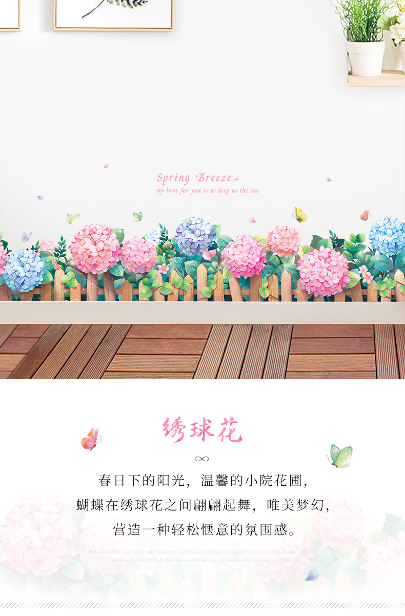 Warm and creative room stickers bedroom layout wall decoration wallpaper kick line wallpaper self adhesive background wall stickers Hydrangea (a set is about 172cm long after being pasted) extra large